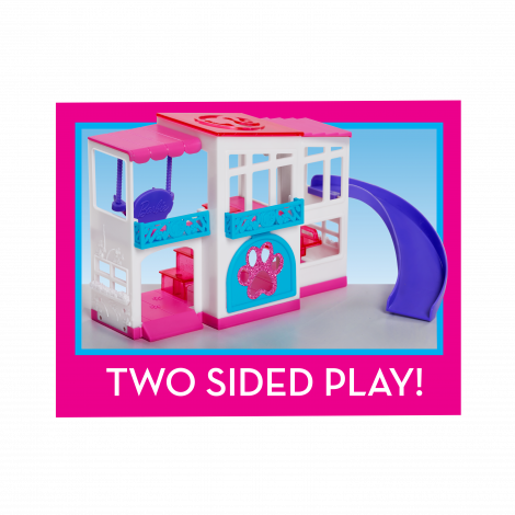 - Set includes: two puppies, one dreamhouse one food dispenser with two bones, one frisbee, one hydrant, one pet convertible, and one pool.