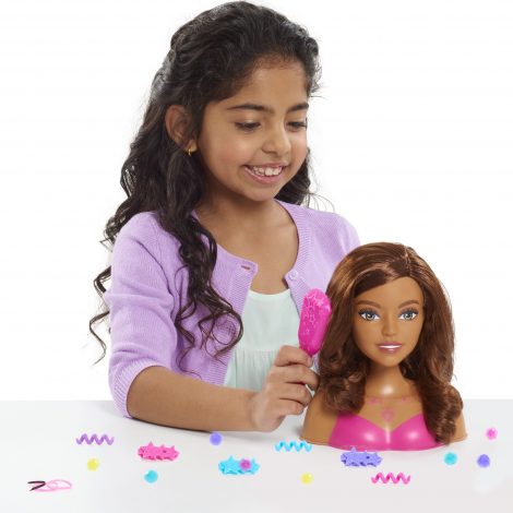 - Includes: one Barbie Styling Head, three customizable barrettes, eight pop-in gems, three hair twists, hair bands and one brush.