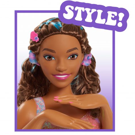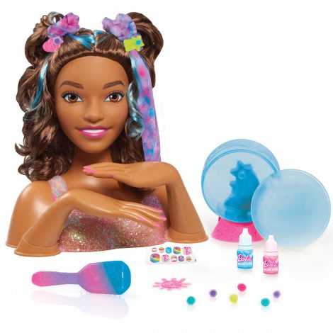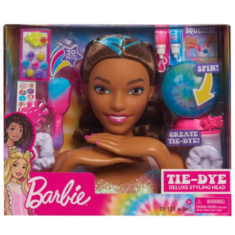 Barbie has added tie-dyed style to her iconic look! Her thick, flowing brown hair with blue streaks is ideal for brushing and braiding into trendy and creative designs. Little stylists can take the included scrunchies and ribbon to the next level by using the spinner to create custom tie-dye styles! Place the scrunchie or ribbon along with the dye colors into the spinner and spin; the sphere rotates on the base helping to disperse the dye on the pieces! Have fun decorating the customizable barrettes with plug-in gems, and Barbie’s nails with the tie-dye nail stickers. Kids will even have fun showing off their cool style to their friends by wearing the scrunchie and ribbons in their own hair. Barbie will be the trendiest girl around! Full set includes one Barbie Deluxe Tie-Dye Styling Head, one manual tie-dye spinner, one pink dye, one blue dye, two scrunchies, one ribbon, one multicolor brush, two customizable barrettes, eight plug-in gems, one nail wheel, and nail stickers. Ages 3+