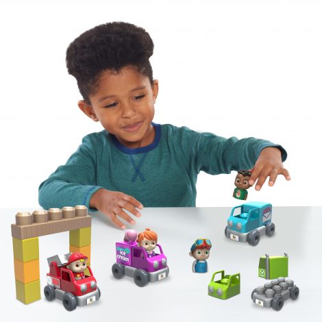 - Children can construct their own CoComelon-inspired vehicle with four easy to attach pieces. Each large block is great for helping little hands build dexterity.