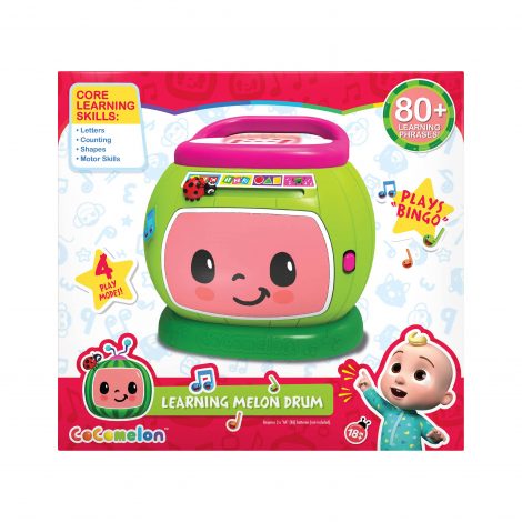 Learn and play with JJ! Inspired by the CoComelon animated series, the CoComelon Learning Drum encourages toddlers to develop core learning skills, while playing a drum. This colorful, melon-shaped electronic toy features a touch-sensitive, interactive surface to teach letters, counting, shapes, and motor skills. Slide the ladybug to select a learning mode: ABC, 1-2-3, Shapes, or Follow the Beat. Preschoolers can tap the top of the drum to activate over 80 phrases. The light-up LED screen displays letters, numbers, shapes, and games. Press the musical note button to play the nursery-rhyme song “Bingo,” and sing along. A wide handle makes the CoComelon Learning Drum easy to carry for on-the-go fun. Bring home the CoComelon Learning Drum, as well as the rest of the CoComelon learning and education toys, to help make curious toddlers happy and smart! Requires 3 x AA batteries (included). For kids ages 18 months and up.