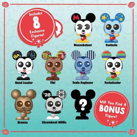- There are eight exclusive Disney Mickey Mouse figures in each collector pack including Band Leader Mickey Mouse, Sorcerer’s Apprentice Mickey Mouse, Train Conductor Mickey Mouse, Bronze Mickey Mouse, Tiki Mickey Mouse, Steamboat Willie Mickey Mouse, Mousekateer Mickey Mouse, and Technicolor Mickey Mouse.