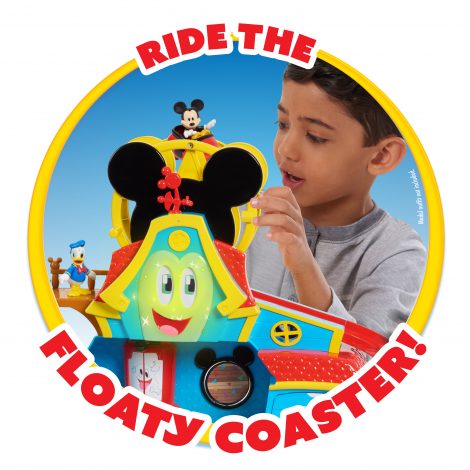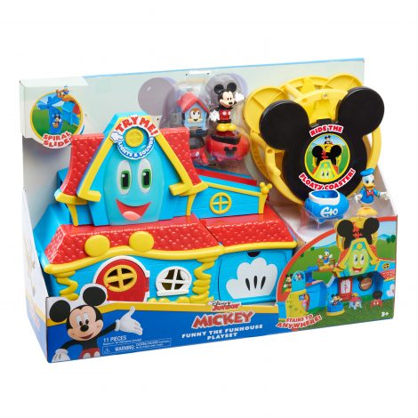 - Funny the Funhouse Playset, 3-inch Mickey Mouse figure and his Floaty Coaster pod, 3-inch Donald Duck figure and his Floaty Coaster pod, spinning sofa, grill, and Teddy the Doghouse. Playset features a Floaty Coaster wheel and two slides!