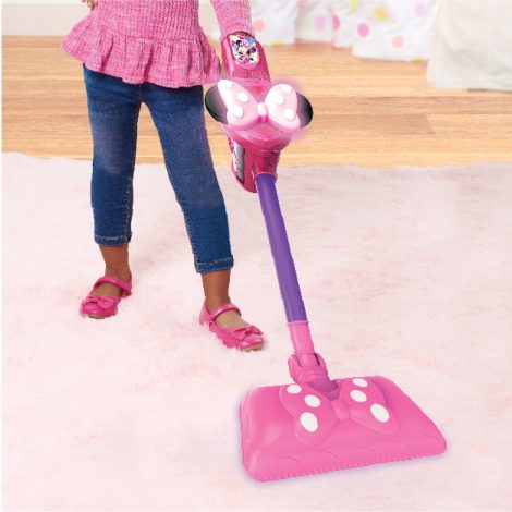 - The Disney Junior Minnie Mouse Sparkle 'N Clean Play Vacuum features a sleek, modern design that looks like a real, upright stick vacuum cleaner. Little happy helpers will love this pretty pink toy vacuum, inspired by the Disney Junior Minnie’s Bow-Toons animated series.