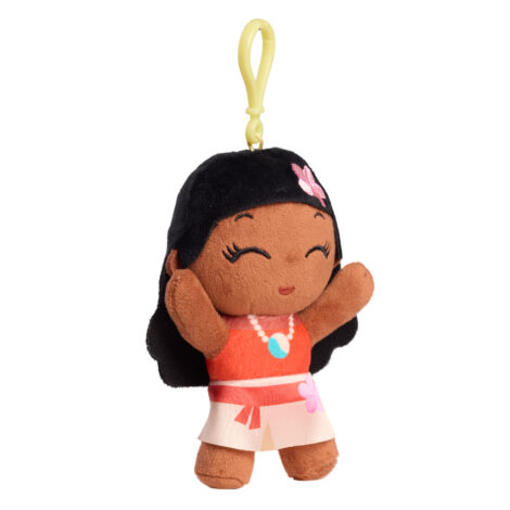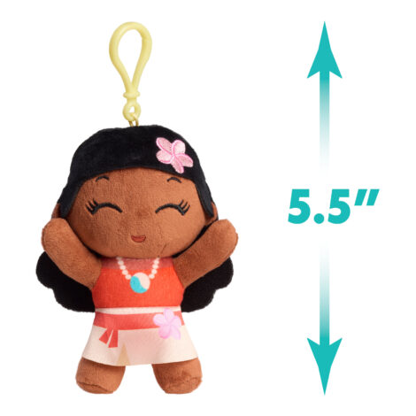 - Cuddly Style, Sweet Fun: Crafted from super-soft mixed fabrics with embroidered and printed details, this 5.5-inch Disney Princess Moana plushie features a plastic clip for hanging on backpacks, purses, instrument cases, bags, zippers, belt loops, and more.
