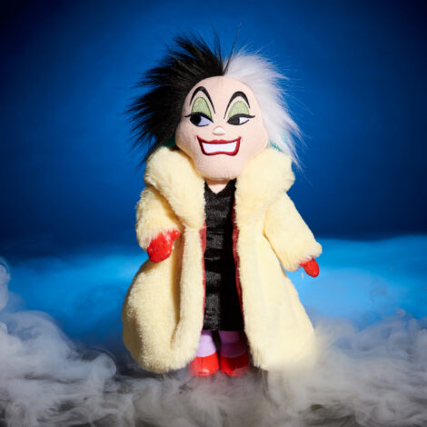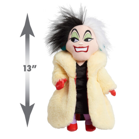 - Excellent Details and Materials: This 13-inch, stylized Disney Cruella De Vil plushie is made of mixed fabrics with exquisitely embroidered facial features and accurate character details. She wears a plush faux fur coat with red accessories.