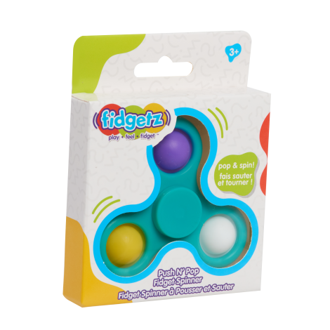 Play, feel, and fidget! Keep restless hands and minds focused with Fidgetz sensory toys. The Pop Spinner combines 2 toys in one! The arms of the spinner contain soft, popping silicone bubbles to push. Hold in the middle and spin the arms to experience the pleasant vibration and soothing blur of pink, green, and blue pops. Small enough to pack in bags or pockets, these spinners are known to reduce anxiety. Look for different types of Fidgetz toys to experience the ultimate sensory sensations including Pop, Stretch, Light Up, Snap & Click, Squeeze, Suction, and Flips (each sold separately). Ages 3+