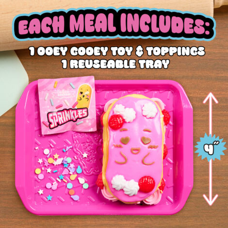 The Ooey Gooey Le Goo Bakery fidget toys serve up sweet-treat fidget fun. Each sticky play pastry is made to squash. Collect the Squeezeberry Waffle with blueberries, Goo-La-La Éclair with sprinkles, or Squooshberry Pie with chocolate chips. Styles may vary. Each one looks good enough to squeeze, so go ahead and smoosh! Then, watch as they transform back to their original shapes. Open their resealable bags and pour in the play toppings, then close the bag and enjoy satisfying sensory play. Kids and hangry fidgeters will reach for these fidget toys before, after, and in-between every meal. For a late-night munchies-fueled fidget frenzy, add the Ooey Gooey Gooey Grill items, including Squeezy Cheesy Fries with jalapeños, Chicken BBGoo with cheese puffs, or Smooosh Burger with chips. Each sold separately. Even though they look good enough to eat, remember that these FRESHLY FAKED items are not actual food. They will, however, serve up big smiles as birthday gifts, holiday presents, or anytime surprises for fidgety foodies and kids ages 3 years and up.
