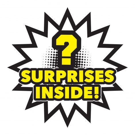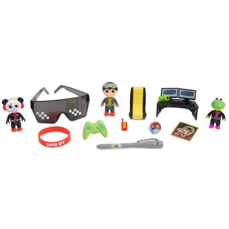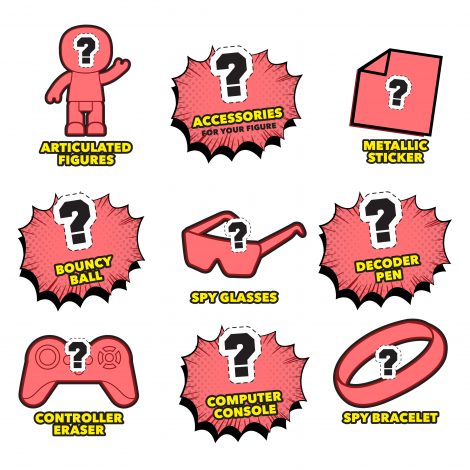 - Surprises include three spy figures, two figure accessories, a UV spy pen, a controller eraser, a bouncy ball, a spy chair, a spy computer console, a super gamer bracelet, glasses, and a metallic sticker.