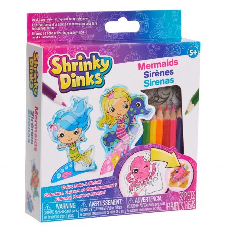 Little artists can turn their visions into reality with the Shrinky Dinks Minis Mermaids Kids Art and Craft Activity Set! This 28-piece set includes colored pencils, stands, and preprinted Shrinky Dinks kids can use to create one of a kind pieces of art. Each Shrinky Dinks design even comes precut, making it easier and safer for kids to use. With three easy steps, kids can spend a rainy day transforming magical images into adorable three-dimensional figures! Use the included colored pencils to trace or draw and color each sheet. Then bake and shrink! Create under the sea adventures with mystical mermaids, hidden treasure chests, fishy friends, and more. Kids will love showcasing their works of art! Adult supervision required. Ages 5+