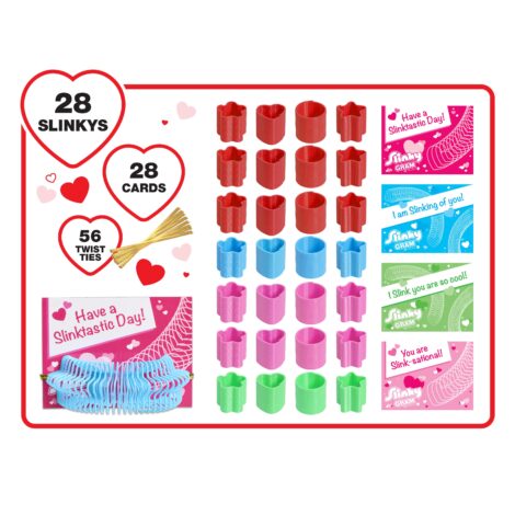 - Includes: 28 Valentine’s Day Cards, 28 mini plastic Slinky® kids’ toys, 56 twist ties.