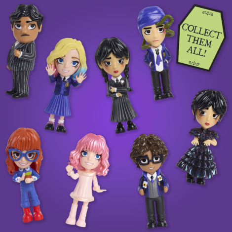 - 8 Figures to Collect: Seek and find Wednesday in school uniform, Wednesday in Rave’N dress, Enid in school uniform, Enid in Rave’N dress, Ajax, Eugene, Marilyn, and Gomez (each sold separately).